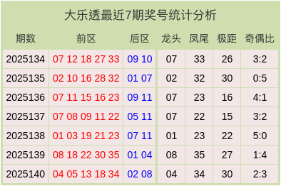 上期大乐透的开奖号码中,首尾组合为04+34,极距为30,奇偶比为2:3。